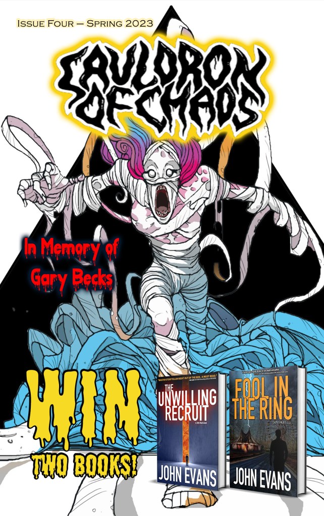 A few days ago we released the digital version of the fourth issue of Cauldron of Chaos, featuring short stories, artwork, interviews, book and movie reviews, artist features, and giveaways. Sadly, the cover artist, Gary Becks, passed away before we could go to print so we have included a special memorial piece in his honour. Available digitally exclusive to Godless here. Print versions of all four issues can be found on Amazon… Issue One, Issue Two, Issue Three, Issue Four.