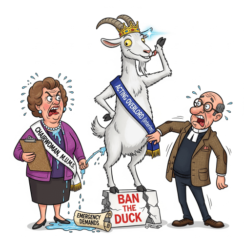 Brenda’s final demand, a nationwide ban on what she described as “irresponsible dice and duck-based literature”, was promptly ignored when the protest goat urinated on her clipboard, declared itself “King of Croydon,” and wandered off with the vicar’s sleeve in its mouth.